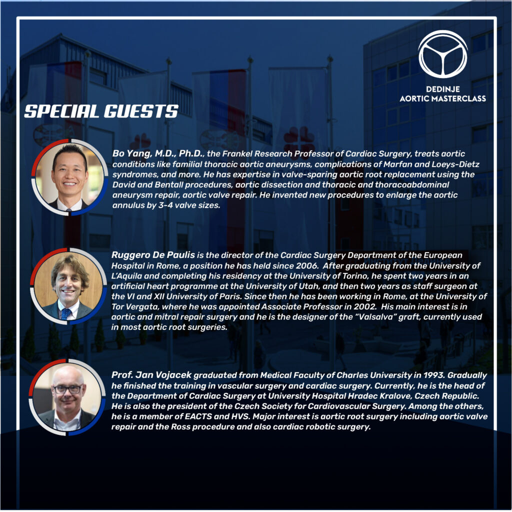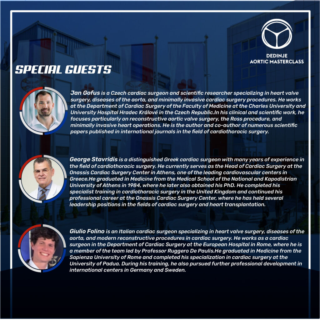 The Dedinje Institute will welcome an esteemed lineup of international guest experts, including Dr. Bo Yang (USA), Dr. Ruggero De Paulis (Italy), Prof. Jan Vojacek (Czech Republic), Dr. Jan Gofus (Czech Republic), Dr. George Stavridis (Greece), and Dr. Giulio Folino (Italy).